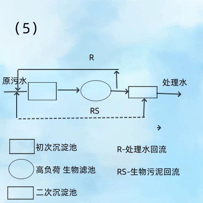 (1)是应用比较广泛的高负荷生物滤池处理系统之一,生物滤池出水直接向滤池回流;由二次沉淀池向初次沉淀池回流生物污泥。这种系统有助于生物膜的接种,促进生物膜的更新。此外初次沉淀池的沉淀效果由于生物污泥的注人而有所提高。