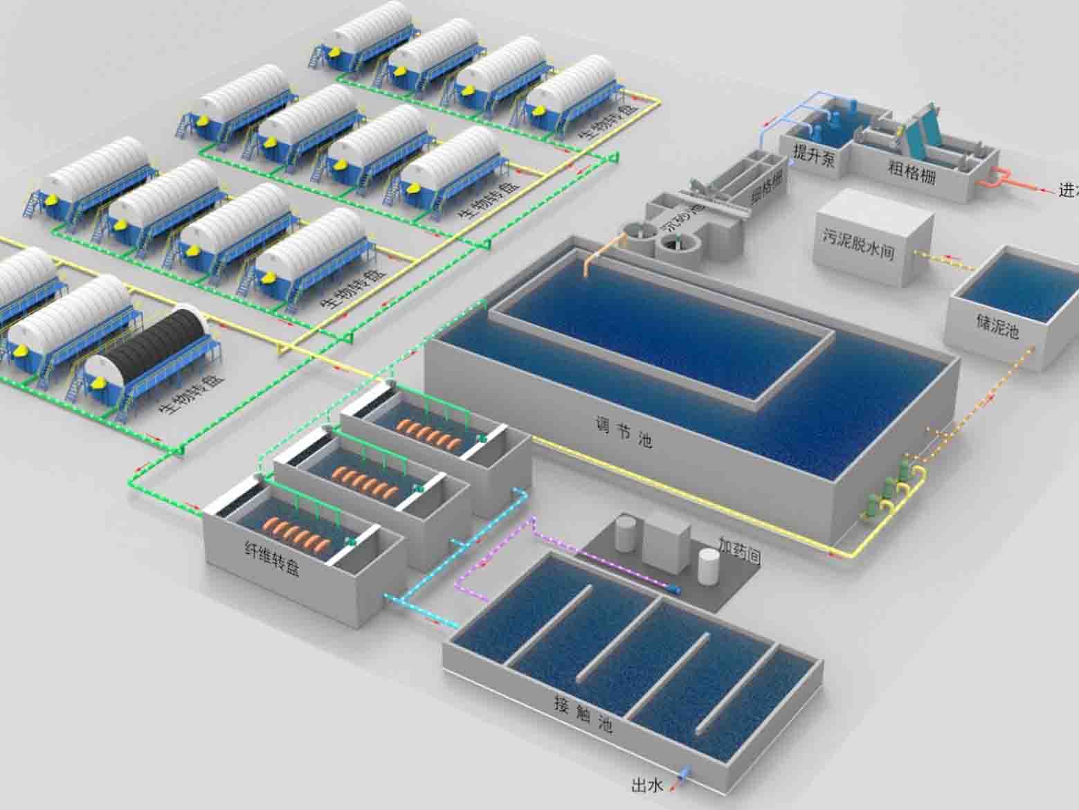 ◇ 固液分离→水解酸化池/调节池→气浮机→ABR折流厌氧→接触碳化→接触硝化→高效沉淀→多介质过滤器/脱泥→消毒→达标排放;